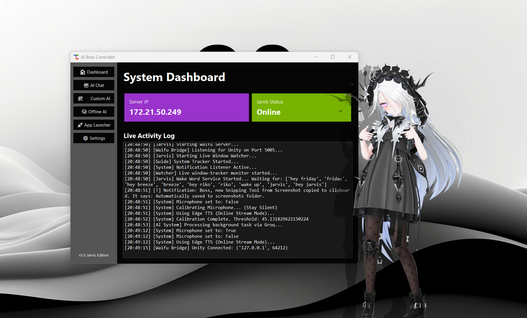 A fully animated VRM waifu AI assistant interface.